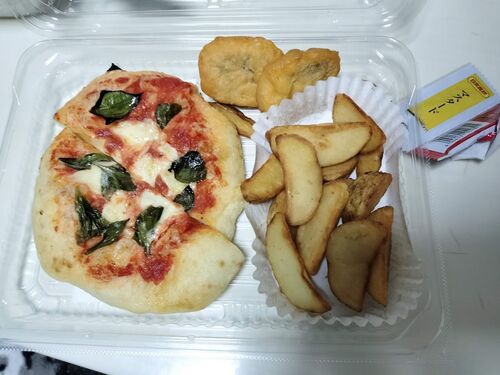 先日イオンの総菜コーナーで面白い商品を発見しました。 ピッツァソリデラBOX 1人用の小さいピザにチキンナゲット2個とフライドポテトがセットになっていて、日本食研のケチャップマスタードが付属しています。 ピッツァソリデラはイオン直営のピザ屋さんで…