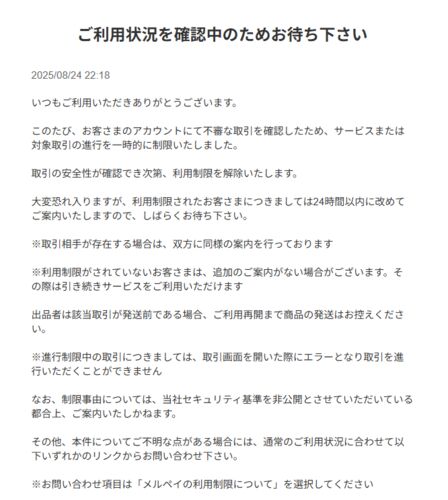 メルペイが夜中に突然止められる 先日の夜メルカリから突如ギョっとする通知が届きました! お客様のアカウントで不審な取引が確認されたので一時的に制限がかかったとのこと。 うーん、夜間に突然メールが来たが全く心当たりがない。 そして数分後に更に通…