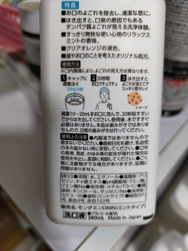 販売名はモンダミンDMNとなっているので、モンダミンブランドの一種という位置づけでしょうか…? 380ml入りで一回当たりの目安が20mlなので、1本でだいたい19回使えます!マウスウォッシュとしてはちょっと強気の価格設定ですが、この手の商品は1000円イメージだったので、個人的にはそこまで高く感じません。